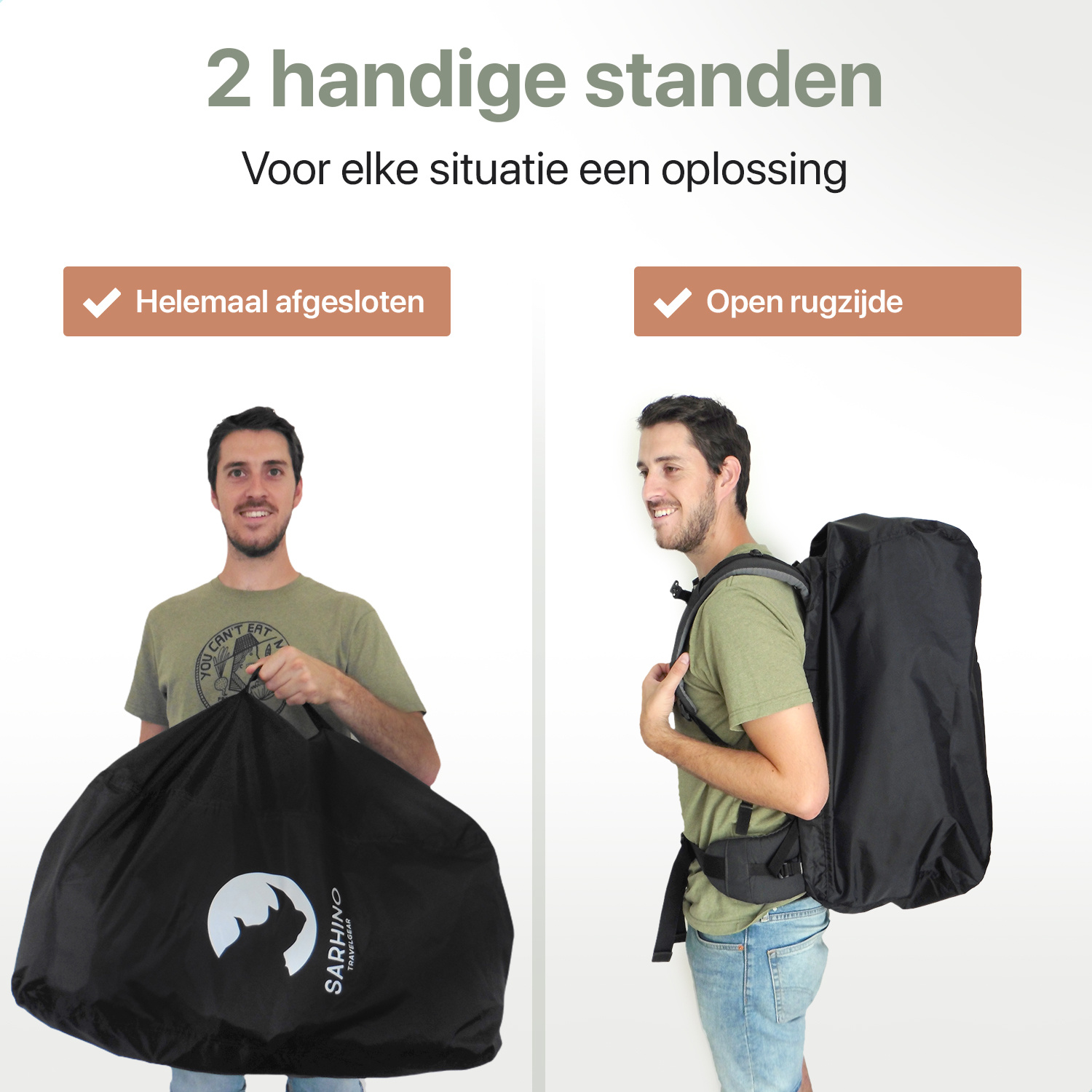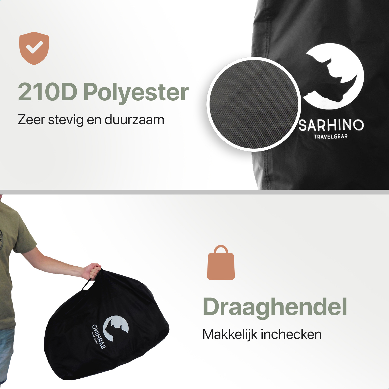 De Sarhino Shield is onze favoriete flightbag! Deze flightbag beschermt je backpack tijdens transport én tijdens regenbuien. Het Shield is namelijk zowel als vliegtuighoes en als regenhoes te gebruiken! De hoes is degelijk en praktisch compact op te bergen, en bovendien zet Sarhino (South African Rhino) zich in voor de bescherming van de neushoorn in Zuid-Afrika! Een doel dat we zeker steunen.